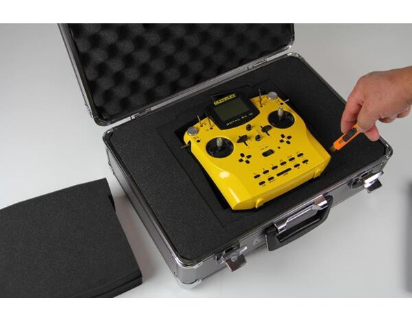 Hochwertiger, abschließbarer, stabiler Aluminiumkoffer in attraktivem Design für sichere Aufbewahrung und Transport des Senders. Passend für Sender COCKPIT SX und PROFI TX, ohne Handauflage durch vorgestanzte Schaumstoffeinlagen (individuelle Anpassungen auch an andere Sender/Pulte möglich)