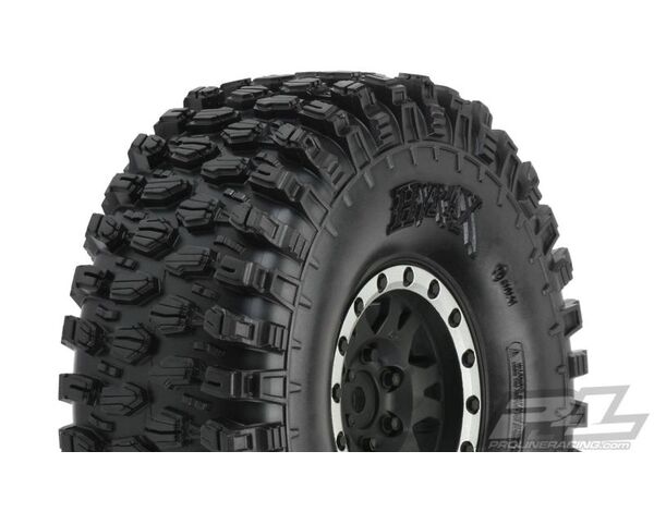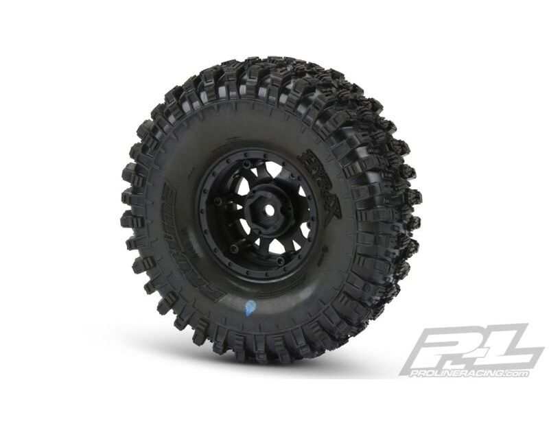 This is a pair of pre-mounted Hyrax 1.9" Tires. The future of 1.9" Tire Performance has arrived with Pro-Line's Hyrax Tire mounted to Impulse Black/Silver Wheels! Designed for maximum grip on the toughest terrain, the Hyrax tire is ready for anything your Scale Adventure might throw at you. The Hyrax features an aggressive and open tread pattern with each tread block containing multiple Sipes for incredible tread flex. The highly detailed connected tread on the sidewall of the Hyrax extends out for unmatched side-hilling performance. The Hyrax also features futuristic stepped tread blocks that create even more forward gripping edges that dig into slick rock like no other scale tire Pro-Line has produced to date! The Hyrax is made from Pro-Line's Legendary G8 material, so you know it provides performance you can depend on.
