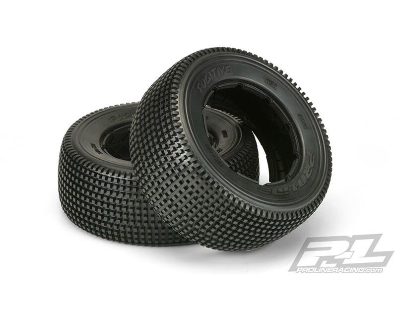This is a pair of 1:5 Scale Fugitive S2 No Foam Tires. Based on the tire that Ty Tessmann used to win the 1:8 Buggy World Championships, Pro-Line is Proud to Introduce the Fugitive for 1:5 Truck! Pro-Line is putting the competition on the Run with the Fugitive race tire! It was developed to be the longest lasting race tire ever produced while still being quick and agile. In the past, the prevailing knowledge for creating a new tire that lasted throughout the long A-Mains in extreme wear conditions was to design a big and tall tire tread that was spaced out. While this was effective for the day, the tall and stiff tread numbed out the handling and didn't have the speed of the smaller pin race tires.
