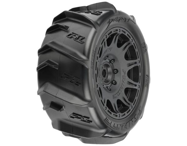 This is a pair of Dumont Paddle Sand/Snow Tires Mounted on Raid 5.7" Black Wheels. Are you ready for the most extreme Paddle tires Pro-Line has ever made for Monster Truck? Introducing the Dumont 5.7" tires that have been designed from the ground up for your X-MAXX® and KRATON™ 8S to sling sand and snow further than ever before and look good doing it!