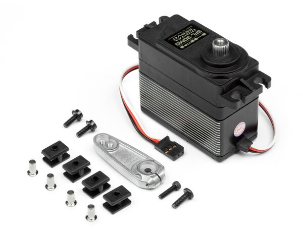102612 - SFL-30MG DIGITAL SERVO (HIGH TORQUE/18kg-cm 6.0V) Baja/Digital FET Servo/drehmomentstark/Metalgetriebe/25 Spline-Abtrieb New from HPI is the high performance SFL-30MG Digital Servo that is perfect for use on the steering of HPI Baja trucks and buggies. The SFL-30MG digital servo offers precision steering movements, and is compatible with all radio systems on the market today, including high-speed systems. This servo has a high-output heavy duty motor which offers a continuous 18kg-cm [249.96oz-in] of torque through the entire servo sweep, a heat sink case to keep temps down, a machined metal gear train, including a new hybrid metal/plastic 1st gear, compared to the normal all-plastic 1st gears. Also included is an aluminium servo horn for maximum strength and durability. While the numbers are smaller [18kg-cm vs. 24kg-cm of torque], the SFL-30MG is an "over-all" much stronger servo. The SFL-30MG offers consistent "full-strength" torque across the entire servo-stroke, whereas