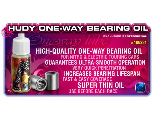 High-quality HUDY One-Way Bearing Oil is used to lubricate one-way bearings for ultra-smooth operation and long lifespan. Super thin to help promote quick penetration and fast & easy coverage. One drop will cure a slipping one-way immediately! Recommended for nitro & electric touring cars, before each race or practice day. A "must have" item for serious racers.