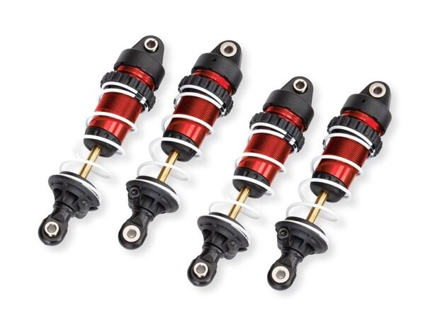 Aluminum GTR ShocksGive your Mini Maxx® the ultimate suspension upgrade with aluminum GTR shocks. The brilliantly-anodized aluminum shock bodies are coated with PTFE for the slickest damping action available. Their large bores hold more oil than standard shocks for conistent dampening over the roughest terrain. Slick titanium-nitride coated shafts resist scuffing, increase durability, and eliminate "stiction." X-rings keep oil in and dirt out for smooth suspension action. Spring preload and ride height changes are as simple as turning the threaded spring collars. The lower spring retainers even feature a locking screw to prevent annoying pop-off in the middle of your run. Shocks come assembled with springs and silicone oil is included in the package. Sold as a complete set of four.