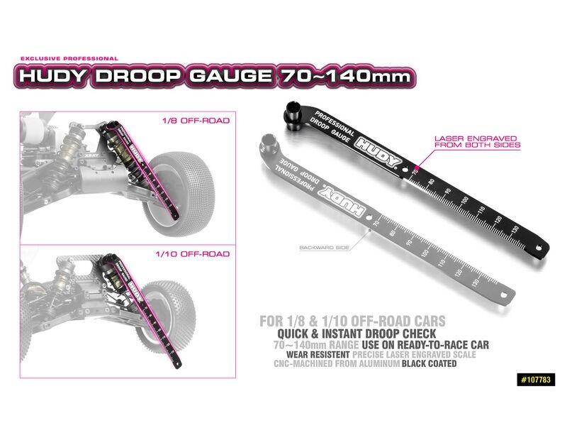 Professional droop gauge to check the drop of the suspension downtravel in range 70~140mm. Great for quick and instant droop check directly on ready-to-race car with no other set-up equipment needed.