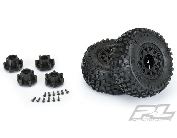 The Badlands SC tires are mounted to a pair of Raid SC Removable Hex Wheels. We take the guesswork out of your glue job by doing the mounting for you so you can spend your time having fun! Pro-Line is proud to introduce a true next-generation Short Course wheel design – the Raid 2.2"/3.0" Removable Hex Wheel for all Short Course Tires! Imagine being able to easily change the offset of your wheel to fit different applications by simply changing out the hex! Now you can with the new 6x30 Removable Hex system from Pro-Line. The wheels include a pair of 12mm Slash® 4x4 Front/Rear (Slash® 2wd Rear) hexes and a pair of 12mm Slash® 2wd Front hexes that fit the most popular trucks. Optional 14mm, 17mm and ProTrac™ offset 12mm hexes (6355-00) are available separately to fit your exact application. If your wheel hex ever gets damaged, it can easily be replaced without needing to replace your glued tires (6354-00 Replacement Slash® Hexes)! These new Raid SC wheels accomplish all of this and more by using Pro-Line's unique 6x30 interlocking hex design that is secured to the wheel by 6 M3 screws that are spaced 30mm across. The built-in adjustability and ease of use make this a new must-have wheel for Short Course Trucks everywhere! Get your new Raid SC pre-mounted tires today!