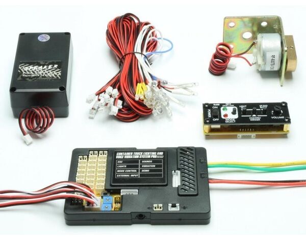 Geniale Multifunktionseinheit MFE-02 für LKW und Truck Fahrzeuge. Beleuchtung für Trailer / Container als Sonderzubehör erhältlich! Komplette All-In-One Lösung mit vielen Effekten Beleuchtung, Sound, Vibration. Damit erwacht Ihr LKW zum Leben! Produktmerkmale * Einfach zu installieren * Kinderleichte Bedienung * Alles steckfertig vorinstalliert * Vibrationsmodul und Lautsprecher * 60A Regler für Brushless- und Bürstenmotor integriert * SBUS * Betriebszustände und Beleuchtung über Smartphone APP steuerbar Technische Daten Betriebsspannung = 7 -14V Belastung max. pro Lichteffekt = 30mAh Lautsprecher = 4 Ohm / 10W R/C Anlage = mehr als 4 Kanäle erforderlich Belastung max. Antriebsmotor = 60A 39 Sound Effekte Alarm 1 - Alarm 2 - Motor Anlasser - Motor Leerlauf - Gebläse - Gasstoß - Fahrgeräusch - Auflieger einrasten - Auflieger ausrasten - Motor runterschalten - Motor hochschalten - Luft ablasse