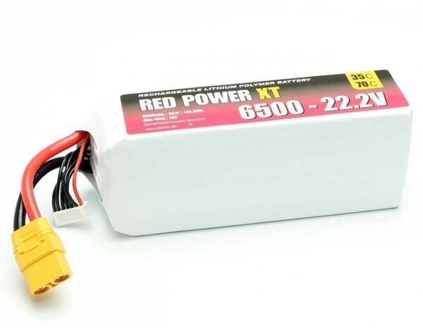 RED POWER XT Lithium Polymer (LiPo) Akkus zeichnen sich durch ein optimales Gewichts/Leistungsverhältnis aus und sind für fast alle Anwendungen die erste Wahl. Fertig konfektioniert mit dem führenden XT Steckersystem. Produktmerkmale * Niedriger Innenwiderstand für hohe Belastbarkeit * LMT (Lithium Molecular Tech) für weniger Gewicht und mehr Leistung * Speziell entwickelt für den R/C Modellsport * Leicht und kompakt * Streng selektierte Top-Qualität * Frische Ware aus neuester Produktion * 30-Punkte Qualitäts Check Technische Daten Kapazität = 6500mAh Spannung = 22,2V Energie = 145Wh Konfiguration = 6S1P Belastung Dauer max. = 225A (35C) Belastung Kurzzeit max. = 455A (70C) Abmessungen (LxBxH) = 150 x 45 x 60mm Gewicht mit Kabeln = 915g Stecker = XT90 + Balancer XH
