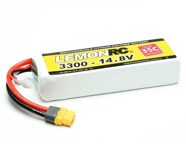 LEMONRC LiPo Akkus zählen seit über 15 Jahren zu den meistverkauften Lithium-Polymer Akkus. Dabei wurden die Marke LEMONRC im Hinblick auf Leistung und Lebensdauer ständig mit Hilfe neuester Technologien weiterentwickelt. Mit einer Dauerbelastbarkeit von bis zu 35C (70C Kurzzeit) bieten LEMONRC XT LiPo Akkus genügend Leistungsreserven für fast alle Anwendungen im R/C Modellsport. LEMONRC XT LiPo Akkus sind mit den bewährten XT Steckern ausgestattet. Adapterkabel für andere Steckersysteme sind bei uns erhältlich. Produktmerkmale * Niedriger Innenwiderstand für hohe Belastbarkeit * Kompakte Bauformen und perfekte Verarbeitung * Speziell entwickelt für den R/C Modellsport * Streng selektierte Top-Qualität * Frische Ware aus neuester Produktion * 30-Punkte Qualitäts Check Technische Daten Kapazität = 3300mAh Spannung = 14,8V Energie (Wattstunden ) = 48,84 Wh Konfiguration =