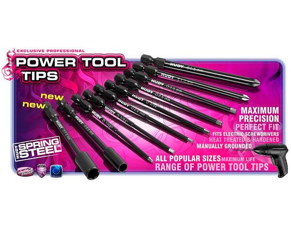 HUDY offers a range of power tool tips for electric screwdrivers, manufactured from world-renowned HUDY Spring Steel™ and available in most popular sizes. The end of the tips are manually grounded for maximum precision and perfect fit to the fastener, and additionally heat treated and hardened for maximum life.
