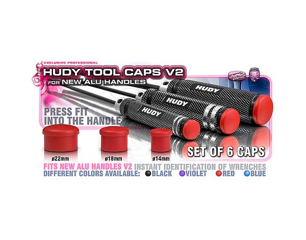 Set of caps for 14mm new Hudy wrenches that are marked as V2. Caps are press fit into the handle ends, allowing for instant identification of your wrenches. Great add-on for all new V2 Hudy wrenches. 6 same-colored caps in a set. Sets are available in different colors: black, violet, red, blue.