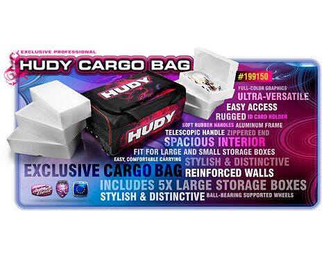 Smart, stylish, and distinctive and ultra-versatile HUDY Cargo Bag to transport all your RC car equipment. The Cargo Bag is large and spacious enough to carry your tools, set-up equipment, and RC gear to any track with comfort and ease. A “must have” for any RC car driver.
