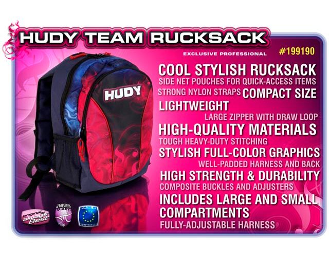 199190 HUDY TEAM RUCKSACK Along with your equipment bags, a trip to the track is not complete without your personal belongings. To keep your belonging safe and protected and close at hand, use the stylish HUDY Exclusive Rucksack. The compact, lightweight rucksack has abundant storage compartments and pouches for quick access to any items. Well padded to withstand the rigors of travel, the spacious interior of the rucksack is easily accessed via large easy-to-use zippers with draw loops. Strong lightweight nylon gives durability, and tough heavy-duty stitching is used throughout the rucksack's construction. The well-padded harness with strong nylon straps and composite buckles and adjusters allow you to comfortably secure the rucksack to your back for extended trips. The padded back surface of the rucksack helps to ensure a high degree of comfort while wearing it. Manufactured in Europe from premium European high-quality materials, everything on this rucksack is premium. Hig