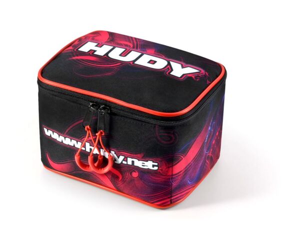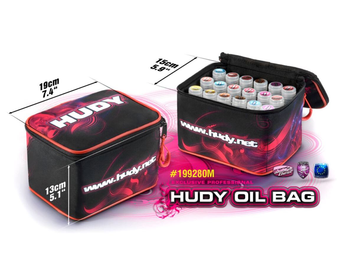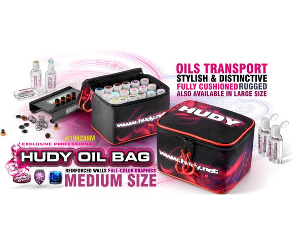 Super-stylish bag to carry all different oils for shock absorbers, air filters, and differentials. The interior of the bag is fully cushioned and has reinforced walls to protect all equipment inside, while being tough enough to handle rough transport and handling. The medium size perfectly fits HUDY medium-size silicone oils. Attractive full-colour HUDY graphics makes this bag stand apart from others.
