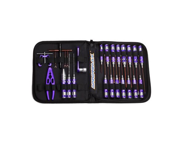 AM-199403 Arrowmax RC AM Toolset FOR OFFROAD (25pcs) with Tools bag AM-110115,ALLEN WRENCH 1.5 X 120MM AM-110120,ALLEN WRENCH 2.0 X 120MM AM-110125,ALLEN WRENCH 2.5 X 120MM AM-110130,ALLEN WRENCH 3.0 X 120MM AM-120120,BALL DRIVER HEX WRENCH 2.0 X 120MM AM-120125,BALL DRIVER HEX WRENCH 2.5 X 120MM AM-120130,BALL DRIVER HEX WRENCH 3.0 X 120MM AM-130130,FLAT HEAD SCREWDRIVER 3.0 X 150MM AM-130140,FLAT HEAD SCREWDRIVER 4.0 X 150MM AM-140120,PHILLIPS SCREWDRIVER 2.0 X 45MM AM-140135,PHILLIPS SCREWDRIVER 3.5 X 120MM AM-140158,PHILLIPS SCREWDRIVER 5.8 X 120MM AM-150150,NUT DRIVER 5.0 X 100MM AM-150155,NUT DRIVER 5.5 X 100MM AM-190001,EXHAUST SPRING / CASTER CLIP REMOVER AM-190002,WRENCH-GLOWPLUG / CLUTCHNUT - 10MM LONG AM-190003,REAMER WITH END CAP FOR LEXAN BODY AM-190008,TURNBUCKLE WRENCH 3MM V2 AM-190009,TURNBUCKLE WRENCH 4MM V2 AM-190010,TURNBUCKLE WRENCH 5MM V2 AM-190015,FLYWHEEL REMOVER (SMALL) AM-190