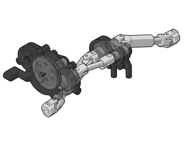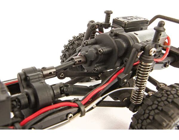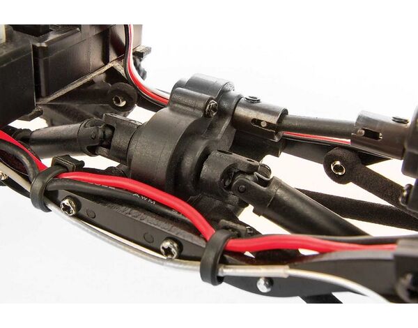 FORWARD-MOUNTED MOTOR and DIVORCED TRANSFER CASE: The forward-mounted motor puts the heaviest part of the rig over the front tires. This forward-bias weight keeps the front tires on the ground and provides better front grip during ascents. The divorced transfer case provides a lower center of gravity in a compact space. Not only does this combination perform well, it also adds scale realism, allowing for plenty of room should you want to add a custom body or interior.