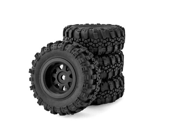 WHEELS and TIRES: Crawl, grip and climb over obstacles with black, injection-molded single-piece rims wrapped in soft compound rubber tires.