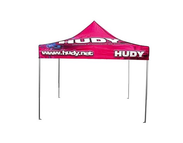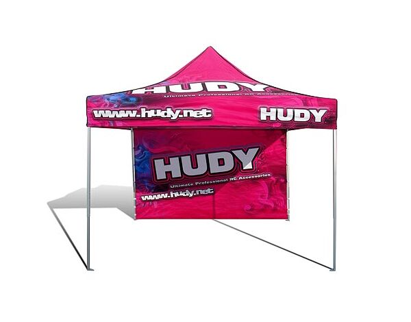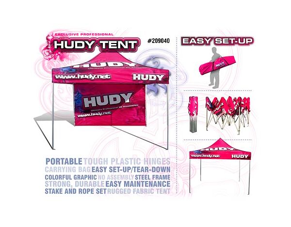 Portable, easy to carry HUDY Tent sets up and tears down quickly and easily: the perfect way to stay cool and be cool at the track! The smart design and high-quality construction will ensure many years of trouble-free use. Powder-coated steel frame is strong and durable, with tough composite plastic hinges and corner pieces. Smooth, sure action when setting up and tearing down. Bright, colorful yet rugged fabric tent with HUDY graphics is attached to the frame so that set-up is very simple; no assembly required. Caring for the fabric tent is very easy with water & mild detergent cleanup. Ensure tent is completely dry before closing & storage.