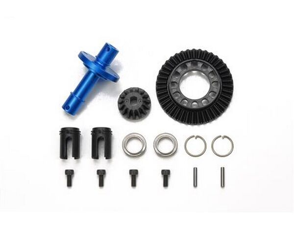 Used in place of the standard gear differential, this front direct coupling improves initial acceleration and makes your car more stable on the brakes. The set includes 39T ring gear, bevel pinion gears, aluminum front direct couplings, joint cups and more. The image at right shows an assembled example.
