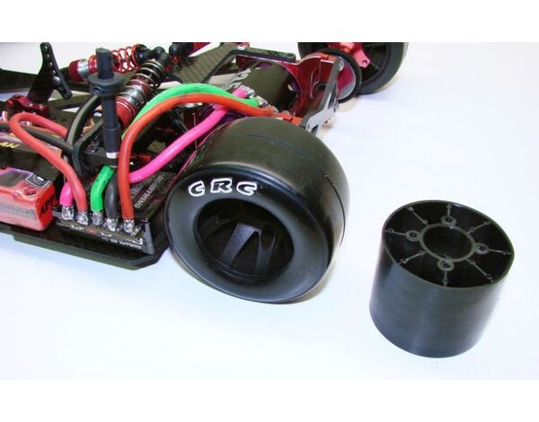 These new tires are RACE PROVEN to provide great grip on carpet and asphalt. The tires have many months of testing and provide excellent grip and handling on both low-traction asphalt and high grip carpet. Under normal conditions, the tires show very little wear and no lap time degradation. The first run on these tires is no faster than the 30th run. The tires respond very well to all the popular additives. Dual scale looks - the tires can be mounted in both NASCAR/F1 style with a larger sidewall or GT style with low profile sidewalls. The tires come with inserts and measure 2.45" in diameter. Fit CRC GTR rims and Tamiya foam rims.