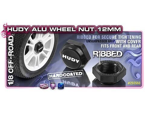 Hardcoated aluminum wheel nut 12mm for 1/8 off-road cars and truggy. Ribbed for secure tightening on the wheel axle. Using these wheel nuts, you will never have problems anymore with dirt getting into the wheel axle assembly! Fits front and rear wheel axles. Set of 2.