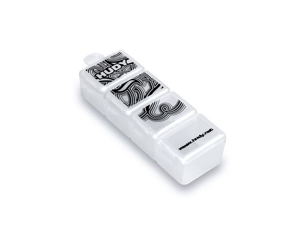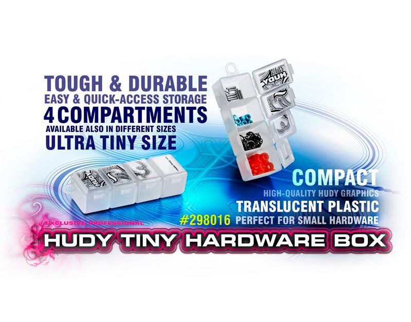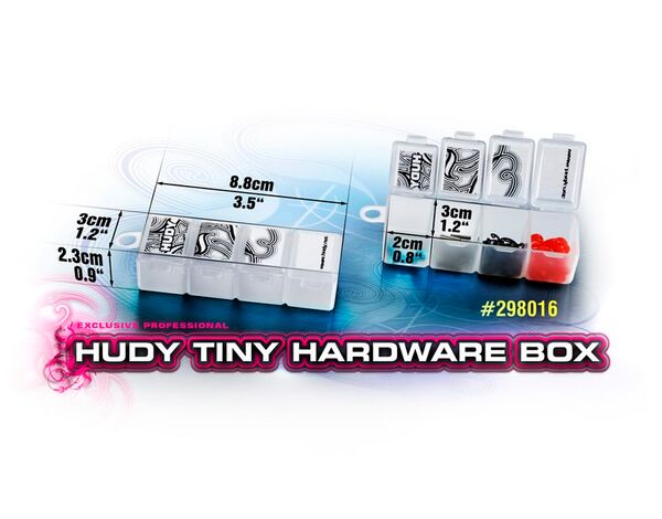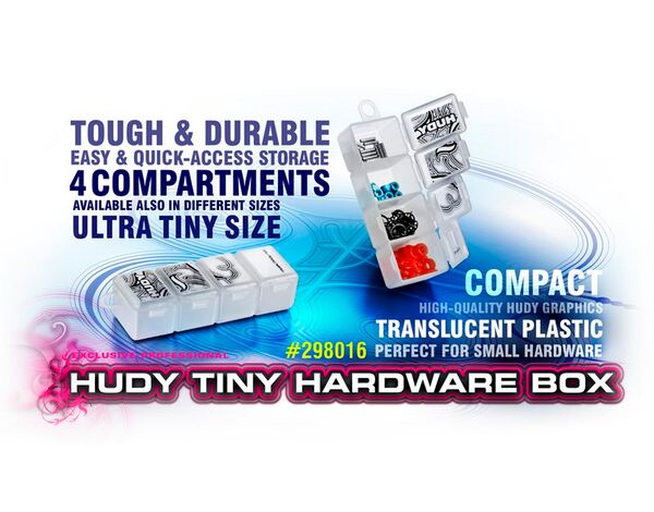 Very handy and useful box for tiny parts storage. Tough, durable, translucent plastic box has 4 compartments, each with a separate latching cover. Easy, quick-access storage for small parts. High-quality HUDY graphics. Dimensions: 88 x 30mm (3.5’’x0.9’’).