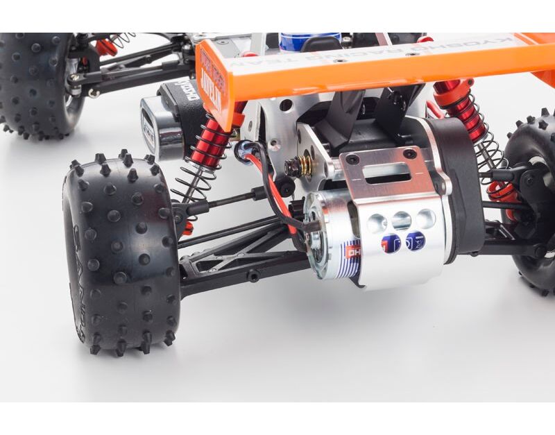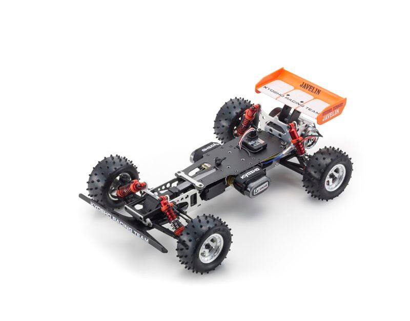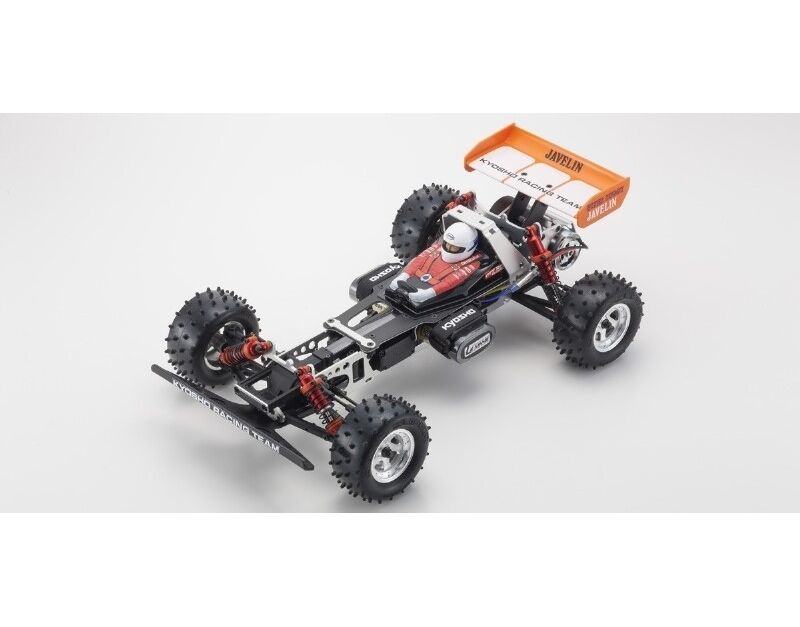 The Javelin’s design concept was to create “A machine that redefines what it means to be the best”. After more than 30 years since the original release in 1986, this electric off-road competition model has been recreated as the sixth model in the Kyosho Vintage Series. Incorporating a resin pipe-frame body resembling the innovative aluminum pipe frame body of the 1/8 scale Land Jump engine powered buggy, the new Javelin features the proven performance of double wishbone suspension with a narrow backbone-style skid frame that delivers ideal geometry for wide-angled steering. This combines with the Javelin’s superior sealed compartment 4WD chain-drive system to produce excellent performance and durability. At the heart of the external features that faithfully represent the image of the Javelin of 30 years ago, this Vintage Series version is packed with modern racing performance potential and is compatible with modern power sources. At the heart of the drive system is a counter gear equipped with slipper function and a final gear case made from metal to strengthen its load bearing capacity. The adoption of precision 48-pitch gear modules reduces power loss and the optimal combination of nylon and sintered alloy delivers both improved drive efficiency and reduced noise. In addition to chain drive, the drive system can also be changed to a belt system, which was optional in the original model. Also, the large diameter aluminum shocks, recreated in the original design, combine with long stroke suspension to deliver increased performance potential. Rediscover the joy of off-road buggy racing with the latest in racing technology and the nostalgic style of the ‘Javelin’.
