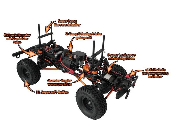 Die Beliebtheit von Crawler-RC-Modellen steigt immer weiter. Auch aus dem Hause df Models bekommen Sie nun ein weiteres Crawler-Modell. Der neue DF-4S Scale-Crawler 313mm JYM Edition hat ein Metallrahmenchassis, Differentialsperren, Super-Torque-Crawler Motor und einen speziellen, jetzt LiPo-tauglichen, Crawler-Regler. Ein 2-Gang-Schaltgetriebe sowie eine elektrische Seilwinde runden das Modell ab. Über die neue 5-Kanal-Anlage lassen sich die neue LED-Beleuchtung mit Blinkern und Bremslicht ein-/ ausschalten, das 2-Gang-Schaltgetriebe bedienen und die Seilwinde vor und zurück steuern. Es sind bereits viele Aluminiumteile verbaut. Die Karosserie ist höhenverstellbar um diese so auf die individuellen Bedürfnisse anzupassen. Extrem Geländegängig, lange Fahrzeit und Supersoftreifen lassen das Crawler-Herz höherschlagen.