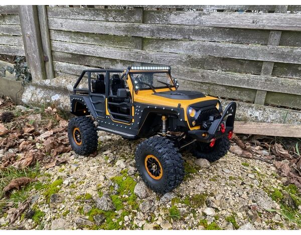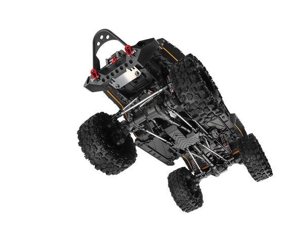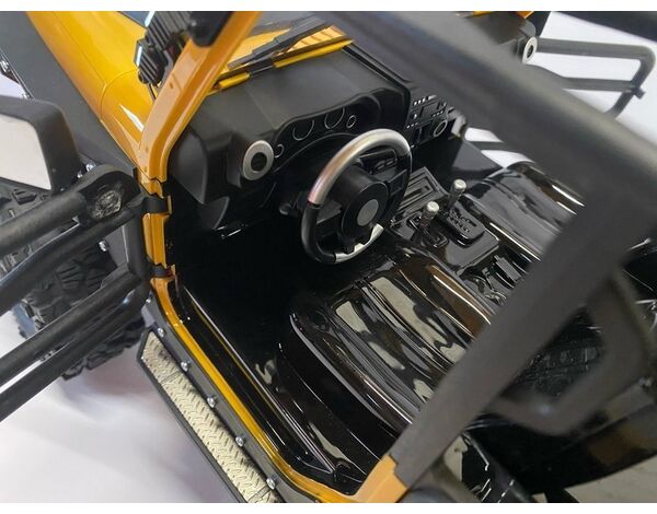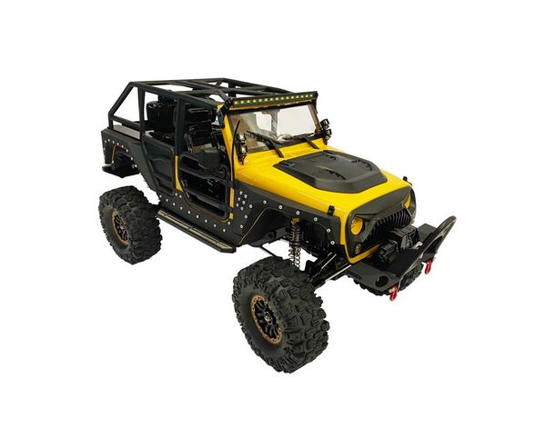 Der DF-4S PRO Crawler von DF Models ist ein High-End Crawler der Spitzenklasse mit 313mm Radstand. Unter der Hartkunststoff Scale-Karosserie mit vielen Details und Anbauteilen sowie ein voll ausgebautes Cockpit und Türen, die sich öffnen lassen, verbirgt sich das Stahlrahmenchassis. Metall-Verstrebungen und Lenkstangen liefern die nötige Stabilität. Senkrecht verbaute Voll-Aluminium-Öldruckstoßdämpfer liefern perfekte Performance in jedem Gelände. Das schaltbare 2-Gang-Getriebe lässt langsames Crawlen (ca. 3 km/h) und zügiges Fahren (ca. 13 km/h) zu.