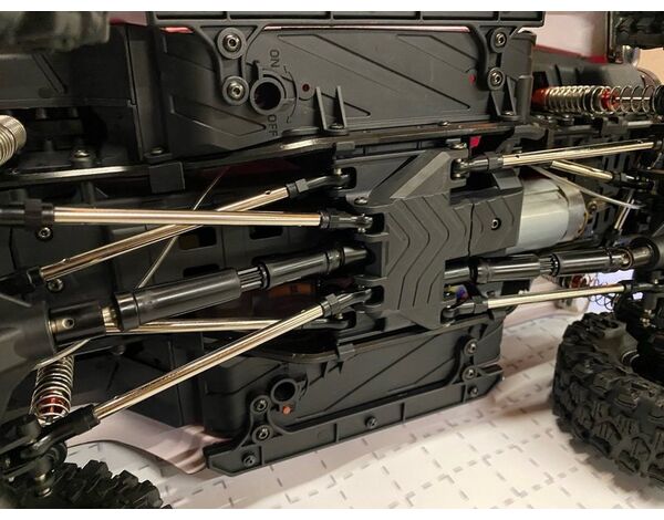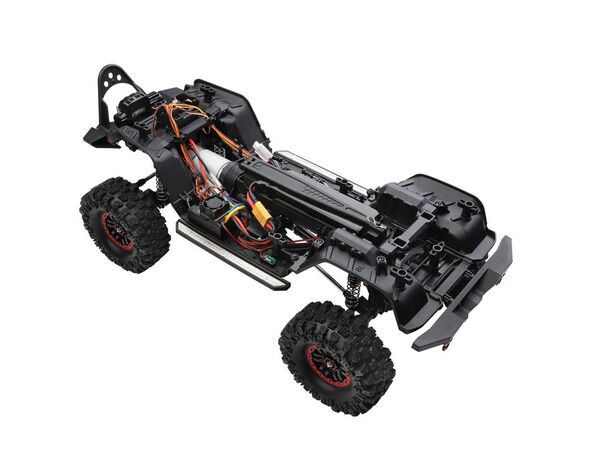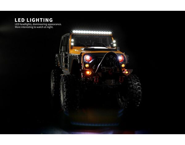 Der 550er Elektromotor wird mit einem 7,4 Volt - 2200mAh LiPo Akku befeuert und erlaubt so Fahrzeiten bis zu 60 Minuten. Dank der universellen Akkuhalterung sind nahezu jede Art an Akkus zu verwenden. Die Scale Karosserie ist mit einer LED-Beleuchtung versehen (Lichtbalken, Suchscheinwerfer, Rückfahrlicht, Bremslicht, Blinker). Die elektrische Seilwinde mit Stahlseil kann per Fernsteuerung