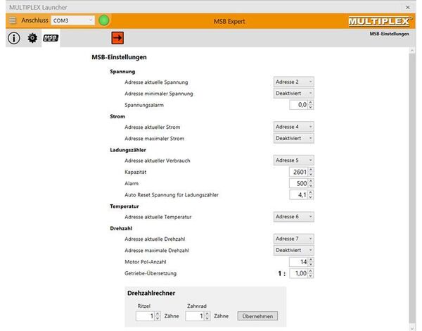 318578 ROXXY Smart Control 45 MSB Telemetrie-Regler Telemetrie-Regler für MULTIPLEX M-LINK-Übertragung Programmierbarer 45 A ROXXY® Telemetrie-Regler für Brushless Motoren plus integrierter Sensorik für MULTIPLEX M-LINK-Übertragung. Die einfachste und kompakteste Möglichkeit der Telemetrie-Nutzung! Natürlich können Sie den ROXXY® Smart Control Reglern mit jedem anderen Fernsteuersystem nutzen und sehr komfortabel über den modernen MULTIPLEX Launcher einstellen. Lediglich die Telemetriefunktion ist nur bei einer MULTIPLEX M-LINK-Übertragung möglich. In diesen ROXXY® Smart Control Reglern sind Sensoren für Spannung, Strom, Temperatur, Drehzahl und Kapazität fest und kompakt integriert. Die Daten, aufbereitet und eingebunden in das MSB-Telemetrie-System, tragen wesentlich zur Information des RC-Piloten bei. In der ReglerserieROXXY® Smart Control ist MSB realisiert. Im Regler ermittelte Werte werden direkt in den MSB eingeschliffen und über M-LINK am Sender