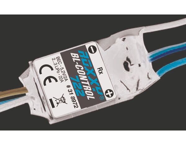 Der ROXXY® BL Control 722 BEC ist ausgelegt für 6...10 NC/NiMH- oder 2..3 Lipo-Zellen. Die Taktfrequenz beträgt 10.000 Hz, wodurch eine sehr gute Feinfühligkeit erreicht wird, welche insbesondere beim „Torquen“ Vorteile bringt. Die Bremse ist per Programmierung zu- und abschaltbar, die Unterspannungsabschaltung einstellbar auf die Werte niedrig-mittel-hoch. Der Motoranlauf kann verstellt werden auf die Werte normal-mittel-soft. Zudem ist das Motortiming in 3 Stufen einstellbar.