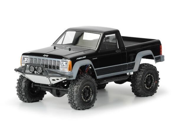 3362-00 Pro-Line JEEP Comanche Full Bed Clear Body for 313mm Wheelbase Scale Crawlers Karosserie unlackiert für: Axial SCX10 12.3" (313mm) Wheelbase Chassis Lieferumfang: Clear Lexan® Jeep® Comanche Body Jeep® Comanche decal sheet Window mask included Paint-then-peel overspray film included his is the Pro-Line Jeep® Comanche Full Bed 12.3" Rock Crawler Body. Jeep® fans rejoice! Pro-Line is pleased to announce the release of the 1982-1992 Jeep® Comanche one-piece body for 1:10 Scale and Crawler rigs (12.3" wheel base). Again, with over the top detail, Pro-Line brings another iconic crawler back to life for the 1:10 Scale Builders. This Jeep® Comanche body is constructed out of a single piece of high quality Lexan, so you don’t have to mess with multiple body pieces. This gets you out crawling faster! One-piece design for 12.3" wheelbase crawlers Perfectly detailed and classic lines create the perfect Jeep® Comanche Full Bed Body Made with Crystal Clear G