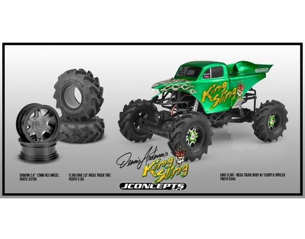 JConcepts has designed and produced a very special wheel for unique vehicle performance. The 2.6” Dragon wheel is a first of its kind, a purpose built 12mm hex mega truck wheel which fits the (#3155) Fling King tires to perfection. The Dragon’s were used in concept and in conjunction with a fully licensed version of the 1:1 scale King Sling. The team worked together to build the ultimate mud runner, and succeeded.