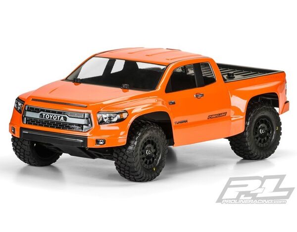 This is a Pro-Line Toyota Tundra TRD Pro True Scale Body for SC Trucks. Toyota Tundra fans can rejoice now that Pro-Line has the Tundra TRD Pro True Scale body for your SC truck! The Tundra TRD Pro True Scale body accurately replicates the real truck and completely transforms the look of your Short Course Truck. This scale truck body is perfect for making your friends jealous and giving your Truck a completely different look! Don’t show up to the local bash spot or track with the same body as everyone else…
