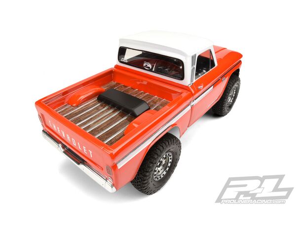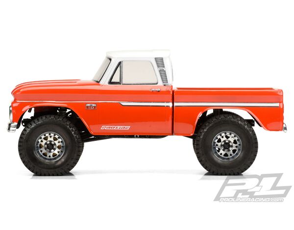 This is a 1966 Chevrolet® C-10™ Clear Body (Cab + Bed) for Rock Crawlers. Pro-Line has a brand new body for all of the Scale Crawler fans: a Licensed 1966 Chevrolet® C-10™ Cab and Bed for the SCX10 Trail Honcho! Now you can make your crawler look even more scale with a ‘66 C-10™ cab on the front and bed on the back. The 1966 C-10™ is a classic vintage truck and Pro-Line’s scaled down version has been carefully sculpted with realistic undercut detail that is only made possible with Pro-Line’s new molding technology. This allowed Pro-Line to faithfully recreate the ‘66 C-10™ down to the most stunning of details! Transform the look of your tuck with the realistic 1966 Chevrolet® C-10™ body from Pro-Line