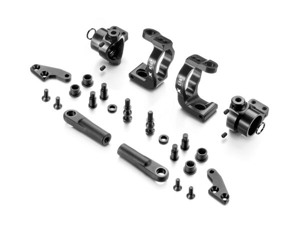 Complete XT8 front suspension upgrade set includes: alu steering blocks, alu caster blocks, and alu steering plates. For easy maintenance, the steering block is mounted using a pivot pin. Increases overall steering, and the car is more forgiving and easier to drive on bumpy tracks.