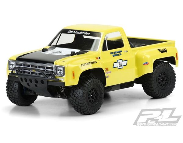 This is a 1978 Chevy® C-10™ Race Truck Clear Body for Short Course. Pro-Line now has the ultimate licensed Chevy® body - the 1978 Chevy® C-10™ Race Truck! This step-side classic truck body features large, full race fenders and styling that will separate your truck from the rest. This well-known and recognizable truck body style won many desert races in the mid to late 70's and was driven by off-road legends Parnelli Jones, Rick Mears and Walker Evans making it the ultimate dream truck to many race fans. The body includes fully licensed Chevy® grill, headlight and taillight decals to complete the look. Give your Short Course Truck the tough look it deserves with Pro-Line's new Chevy® C-10™ body!