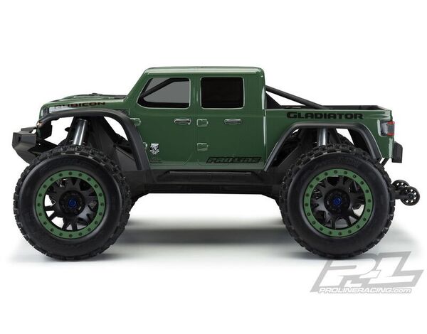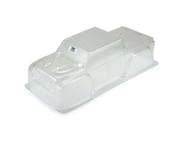 This is a Pro-Line Jeep® Gladiator Rubicon Clear Body for the X-MAXX®. Calling all Jeep® fans! Pro-Line is proud to release the all-new Jeep® Gladiator truck body for your X-MAXX®! The Gladiator combines the iconic and unmistakable Jeep® body styling with the utility and ruggedness of a truck that tells everyone that you are ready for adventure. The Pro-Line Jeep® Gladiator body is pre-cut specifically for your X-MAXX® and is designed to work with the stock cage and body mount system. Pro-Line has included all the scale Jeep® Gladiator detail you would expect into the body and sticker sheet that will completely transform the look of your truck. The Jeep® Gladiator body comes clear, so you can customize the look of your truck in any way you desire.