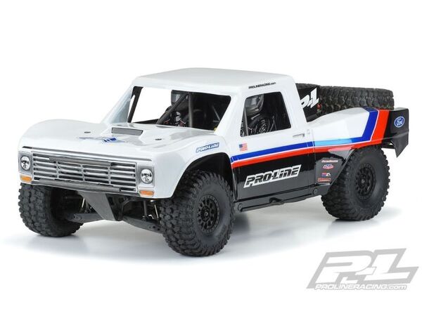 This is a 1967 Ford® F-100 Race Truck Clear Body for the Unlimited Desert Racer®. The 1967 Ford® F-100 is a classic vintage truck that has recently become a popular platform for building full-size pre-runners. Pro-Line is proud to bring the nostalgic and majestic body lines of the 1967 Ford® F-100 to your Traxxas® UDR® for the ultimate in scale realism! This body features the iconic flat front grill and wide fender flares to represent the aggressive fiberglass bulges found on custom race trucks. The F-100 body comes clear so you can custom paint your truck to match anything your heart desires and is made from high quality, crystal clear polycarbonate material. Pro-Line's 1967 F-100 body mounts directly to the cage on the UDR® in the same locations as the stock body and is fully pre-cut for an easy direct fit. Transform the look of your Unlimited Desert Racer® and