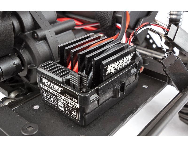 Reedy power electronic speed controller (ESC): The water-resistant brushed ESC is specifically programmed for crawling with proportional forward/reverse, dual auxiliary power output leads, LiPo low-voltage cutoff protections, and T-plug connector.