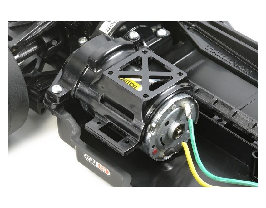 Das wellengetriebene 4WD-Chassis des TT-02 ist in Längsrichtung angeordnet, wobei sich die Batterie auf der linken und der Motor auf der rechten Seite befinden, um eine hervorragende Stabilität zu gewährleisten. Darüber hinaus verfügt es über identische linke und rechte Querlenker und Achsschenkel, was die Montage erleichtert, sowie über leicht zu wartende Getriebe. Es ist ein äusserst anpassungsfähiges Fahrgestell, denn es bietet 2 verschiedene Radstände, 2 Bodenfreiheitsstufen und 2 Profilabstimmungen sowie eine Reihe von 10 möglichen Getriebeübersetzungen. Auch die Optik kommt nicht zu kurz, denn es verfügt über Radnaben in Form von Bremsscheiben und stilvolle Stossstangenhalterungen vorne.