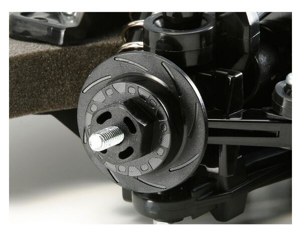 Das TT-02-Chassis mit Allradantrieb und Wellenantrieb verfügt über eine Längsanordnung mit der Batterie auf der linken und dem Motor auf der rechten Seite und bietet somit eine hervorragende Stabilität. Darüber hinaus verfügt es über identische linke und rechte Querlenker und Achsschenkel für eine einfache Montage sowie wartungsfreundliche Getriebe. Es handelt sich um ein äusserst anpassungsfähiges Chassis, da es neben einer Auswahl von 10 möglichen Übersetzungsverhältnissen auch 2 verschiedene Radstände, 2 Bodenfreiheitseinstellungen und 2 Spurweiten bietet. Auch optisch kann es sich sehen lassen, mit bremscheibenförmigen Radnaben und stilvollen vorderen Stoßstangenhalterungen. Mesh-Räder werden mit Renn-Slick-Reifen kombiniert.