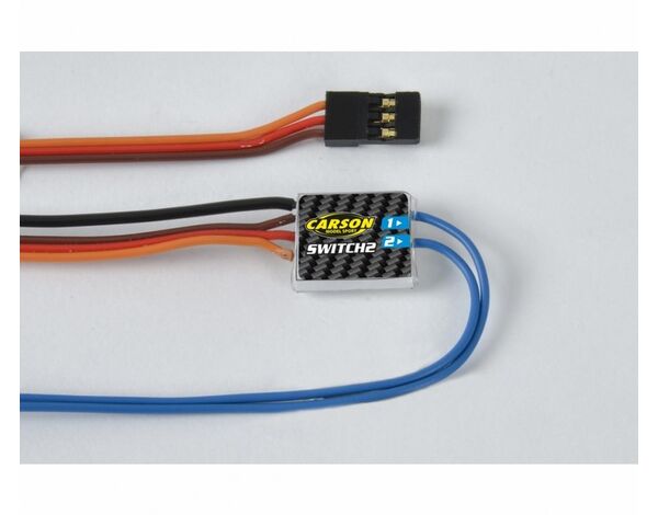 500503060 Carson Modelsport Reflex 6/14Ch Switch 2 (2x2,5A) Die Schaltmodule werden direkt an ihrem RC-Empfänger angeschlossen und können über einen Taster, Schalter oder Knüppel gesteuert werden. Dabei wird die Position des Schalters/Tasters (oben und unten) und die Dauer (kurz und lang) ausgewertet. Bei dem 2-fach Modul wird lediglich die Position ausgewertet. Bei Tastern und Schaltern ist darauf zu achten, dass diese eine Mittelstellung besitzen – sogenannte 3-Positionschalter/Taster (Ein/Aus/Ein). Jeder Schaltausgang verfügt über eine Memoryfunktion: Das heißt, er bleibt so lange aktiviert, bis der Schalter/Taster wieder in Neutralstellung gebracht wird. Auf dem Schaltmodul stehen zwei getrennte und minusschaltende Ausgänge zur Verfügung. Die Ausgänge verfügen jeweils über ein 200 mm langes blaues Kabel. Dieses Kabel ist mit dem Minuspol des Verbrauchers zu verbinden. Jeder Schaltausgang kann einen Strom von max. 2,5 A schalten. Die maximal zulässige Versorgungsspann