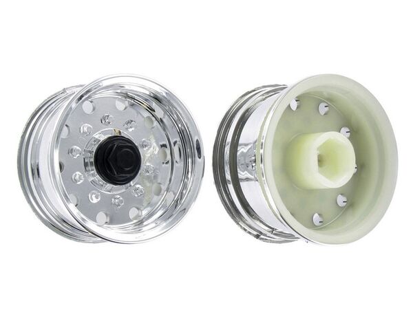 Verchromte Kunststoff-Felge zum Umrüsten der Tamiya-Auflieger von US-Doppelbereifung auf Euro-Single-Bereifung. Ausgeleget für den Fulda Breitreifen Art.-Nr. 500907012.