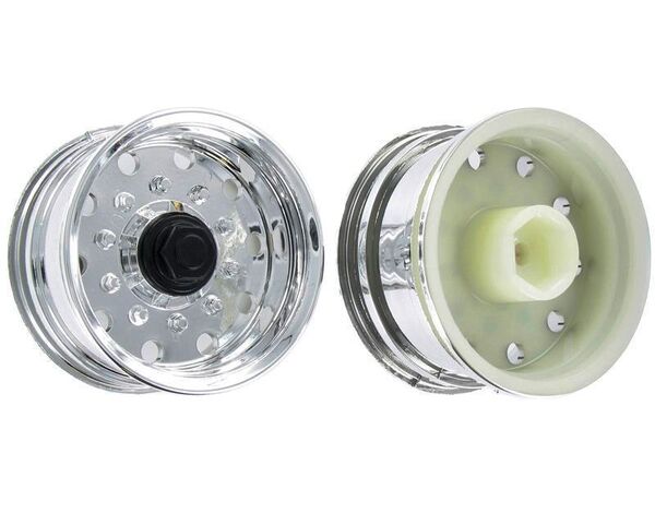 Verchromte Kunststoff-Felge zum Umrüsten der Tamiya-Auflieger von US-Doppelbereifung auf Euro-Single-Bereifung. Ausgeleget für den Fulda Breitreifen Art.-Nr. 500907012.