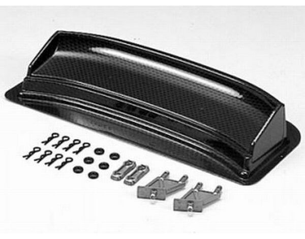This lightweight molded wing has a carbon fiber pattern surface for a racy image! Stays and small parts for attachment are included. Use this wing on any of Tamiya's 1/10 scale touring, and sports car body sets for advanced downforce settings.