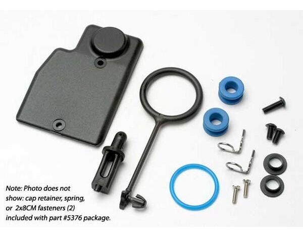 5376 Traxxas Rebuild Kit Fuel Tank (includes Mounting post grommets (2) Tank guard Mounting Clips (2) cap o-ring cap o-ring retainer cap pull ring Spring Hardware)