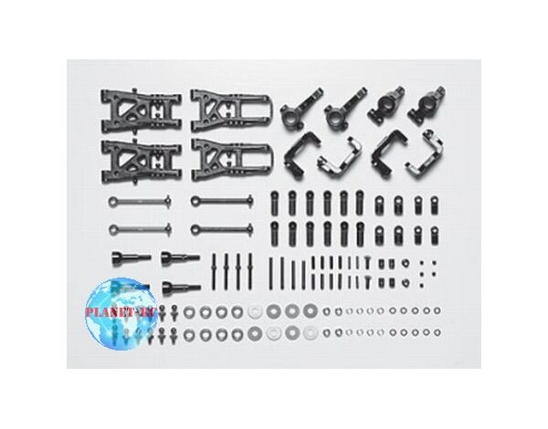 Set contains all necessary suspension components allowing you to add a lightweight suspension system based on the TB Evolution IV to your TB-02 or TA04 chassis. Set includes reversible lower arms, two types of hub carriers, front and rear uprights and universal shafts. Weight savings in suspension system improves handling in corners and makes your chassis easier to control. Reversible lower arms feature 5 pivots offering a wide range of setting options.