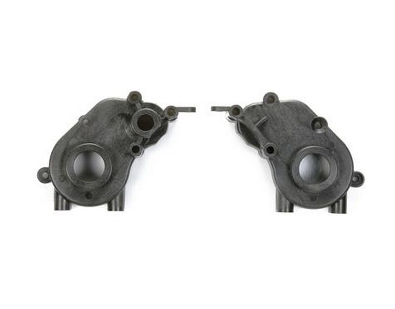Carbon reinforced plastic "gear case" parts for use on the Tamiya TA-06 touring car chassis platform. Carbon reinforced plastic is more rigid than standard FRP (fiberglass reinforced plastic) resulting in less flex characteristics in the performance of the chassis. Less flex is desirable when running on high-traction surfaces.