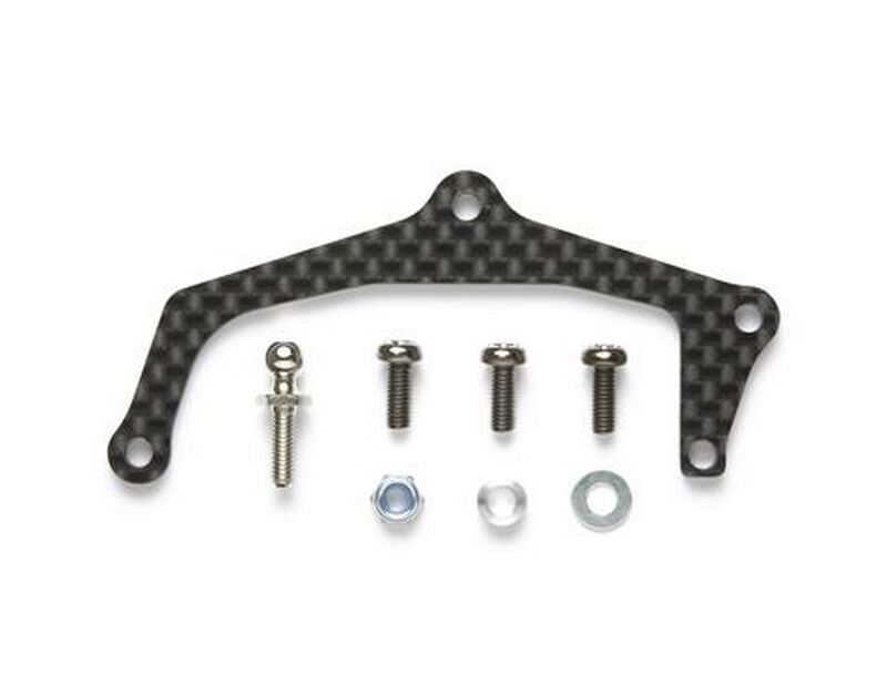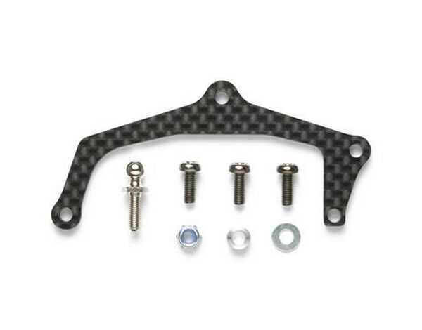 3.0mm thick Carbon Rear Body Mount Plate Set replaces the kit-standard components on the RM-01 1/12 scale chassis to increase the rigidity of the rear pivot section and improve roll damper effectiveness.